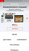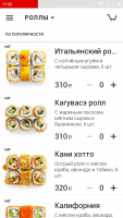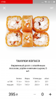 Раздел «меню» удобно раздроблен на подразделы с обозначением категорий. Здесь можно выбрать то, что по душе, не затрачивая время на изучение всего перечня предлагаемых блюд. Например, выбрав раздел «сеты» можно увидеть систематизированные по цене, популярности или даже по калорийности традиционные или праздничные наборы роллов и суши. При этом для каждого блюда есть возможность посмотреть подробный состав и калорийность, добавить его в избранные или поделиться информацией о нем любым способом. Также отдельно выделены новинки, десерты, горячее, напитки и другие. Для семейных случаев предусмотрен раздел «детское меню».