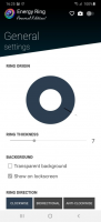 Energy Ring – утилита для ОС Android, которая позволяет использовать кольцо вокруг фронтальной камеры в качестве индикатора уровня заряда. Можно активировать анимацию, а также выбрать цвет каждого сегмента. Данная функция позволяет выделить свой смартфон среди других и использовать нестандартный способ получения информации о разряде батареи.