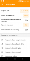 Перейдя в параметры программы, человек сможет выбрать между двумя цветовыми схемами. Стандартный дизайн интерфейса выполнен в белых и оранжевых тонах. При желании можно сменить его на тёмное оформление. Также в настройках разрешается активировать синхронизацию с облачным сервисом. Среди поддерживаемых программой хранилищ имеются Google Drive и Dropbox. При желании можно синхронизировать сведения из утилиты с внешней картой памяти либо электронной почтой.