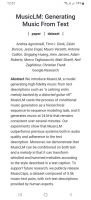 MusicLM – Android-приложение, которое обеспечивает доступ к сервису создания музыкальных треков при помощи нейросети. В качестве исходного набора данных используется текстовое описание. Можно создавать вокал и инструментальную композицию.