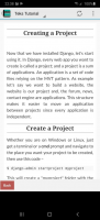 Особенностью утилиты является то, что её учебные материалы подойдут не только новичкам, но и опытным пользователям. Все доступные в приложении занятия разделены на тематические категории, число которых составляет 23. Чтобы человеку было проще ориентироваться в образовательном курсе, разработчики добавили в утилиту оглавление. Пользователю достаточно кликнуть по нужной теме, после чего программа откроет список подходящих уроков.В учебных занятиях имеются не только текстовые материалы, но и также картинки и примеры программного кода. Ещё в приложении присутствуют интернет-ссылки на статьи из официальной документации. Это упрощает изучение ранее упомянутого фреймворка.