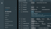 Также удобно реализован доступ к программе каналов, которые доступны в текущем плейлисте. Для фильмов и передач используется наглядная горизонтальная хронология, длина блока указывает на продолжительность эфира.