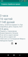 Данный мобильный клиент предлагает оригинальное деление времени, которое применялась славянскими предками. Вы получите информацию о количестве часов, долей и частей в актуальных сутках. Сразу стоит отметить, что применяемые обозначения никак не связаны со стандартным делением времени. Разработчики утверждают, что у славяно-ариев день длится 16 часов. Каждый из них соответствует 90 минутам. А сутки начинаются только тогда, когда осуществится заход солнце.Помимо текущего времени приложение предоставляет информацию о летоисчислении. То есть, вы можете узнать актуальный месяц и сутки, небольшое предписание о поведении в текущий день. У славяно ариев годы классифицированны на три сезона и 9 месяцев. То есть, календарь состоит из весны, осени и зимы. Лето обозначает период, который соответствует году. Он начинается во время осеннего равноденствия. В данной программе вы можете узнать, какое идёт лето в круге жизни у славяно ариев, что весьма интересно.