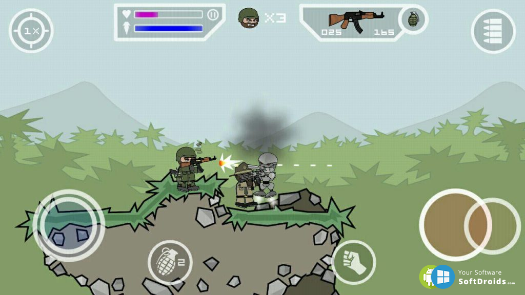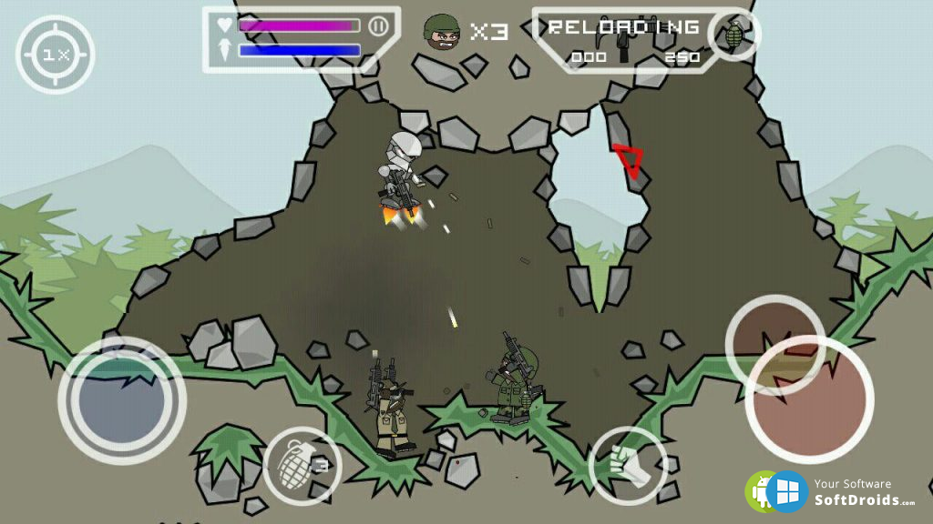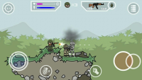 Геймплей игры прост, но увлекателен. Ваш персонаж будет перемещаться по платформам с помощью одного стика, а второй стик отвечает за прицеливание и стрельбу. Чтобы выстрелить, нужно направить прицел в область врага и коснуться экрана. Также можно использовать гранаты для устранения групп противников и применить реактивные ботинки, чтобы быстро перемещаться по труднодоступным участкам карты. Эта механика придает игре динамичности, позволяя игрокам быстро адаптироваться к изменяющимся условиям боя.Дополнительно