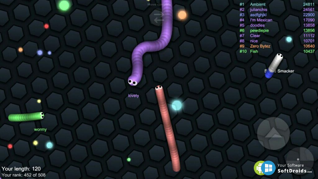 Slither.io — это соревновательная игра на Android, в которой игроки управляют червячками, которые постоянно движутся по игровому полю. Главной задачей является избегать столкновений с хвостами других змей. Если два червячка столкнутся, игра заканчивается для одного из них. Лобовое столкновение является единственным способом устранить соперника. Каждый червячок постоянно растет в длину, и основная цель игры — стать самой длинной змеей и остаться единственным игроком на поле. Для этого нужно подставлять свое тело так, чтобы врезавшийся в него противник отдал вам свои бонусы. Каждый игрок имеет шанс победить.