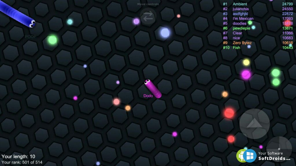 Slither.io позволяет игрокам кастомизировать свою змейку, покупая различные скины. Для этого нужно зарабатывать баллы, принимая участие в матчах. Чем выше вы окажетесь в рейтинге из десяти участников, тем больше баллов получите. Можно также попробовать закрутить спираль вокруг соперников, создавая сложную ситуацию, в которой они не смогут избежать столкновения с вами.Прежде чем соревноваться с реальными игроками, можно потренироваться на ботах, улучшая свои навыки и оттачивая маневры. Управление в игре очень простое: достаточно направлять персонажа в нужную сторону, избегая столкновений и маневрируя между другими червячками.