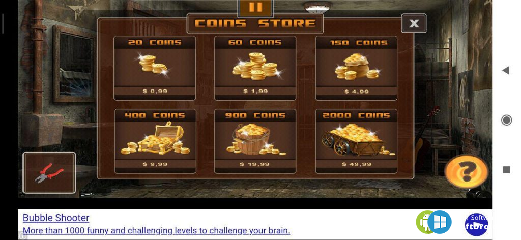 Так как прохождение иногда оказывается запутанным, в игре реализована система подсказок. Если пользователь застрял и не знает, что делать дальше, он может активировать подсказку, нажав на специальную кнопку с иконкой вопроса. Стоимость одной подсказки составляет 10 монет. При первом запуске игры игрок получает 30 бесплатных монет, но для дальнейшего использования подсказок необходимо докупать игровую валюту за реальные деньги.Рекламный контент и его особенности