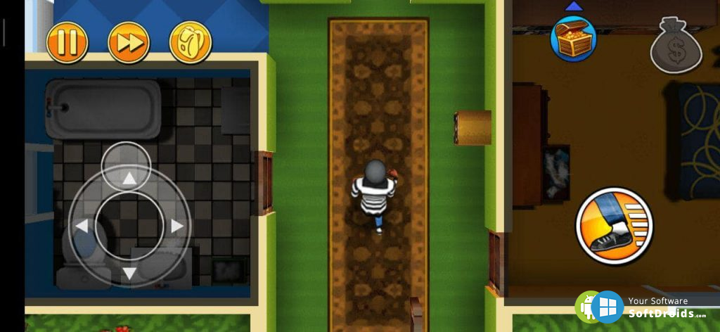 Управление реализовано через виртуальный джойстик в нижнем правом углу. Есть и дополнительная кнопка для временного ускорения, что особенно полезно при побеге. Сами кражи совершаются автоматически. Достаточно приблизиться к нужному объекту.
