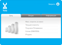Программа Yota Access создана в простой графической оболочке и оснащена приятным интерфейсом. Основное окно программы содержит три каталога: «Сеть», «Опции» и «Информация».В первом окне находятся все данные, которые показывают скорость соединения, максимальную скорость за всё время в сети (после выхода в интернет) и общие показатели отданных и закачанных мегабайт.