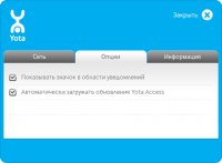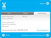 В следующих разделах есть «Опции», которые обеспечивают настойку значка программы, панель уведомлений и количество обновлений в автоматическом режиме. Меню «Информация» отображает версию Yota Access, его прошивку, модель и MAC-адрес.