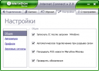 Раздел «Настройки» обеспечивает автоматический запуск программы. После запуска операционной системы Windows, Мегафон Модем запустится и предложит подключиться к сети. В «Настройках» можно выставить автоматическое переподключение, если связь с сетью разорвана.