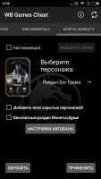 WB Games Cheat – программа, способная взламывать игры от компании WarnerBros. Это приложение, созданное для мобильных устройств с операционной системой Android. Включает в себе читы для Kombat X, Injustice и других.