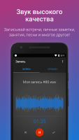 Данное приложение предоставляет пользователю возможность начать запись звука, с помощью встроенного в подключенное портативное устройство микрофон. При этом вам не придется совершать сложных манипуляций, так как весь процесс сводиться буквально к нажатию одной кнопки. Записанное аудио имеет хорошее разрешение, а также битрейт.