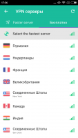 Приложение в автоматическом режиме оценивает скорость соединения с сетью и различными серверами в разных странах, и выбирает наиболее оптимальный вариант. Если вас не устроит выбранный вариант, то можно самостоятельно подключиться к любому из доступных серверов. Это может быть сервер в Канаде, США, России, Франции и др. Имеется и платная версия VPN Master, в которой доступных сервером значительно больше.