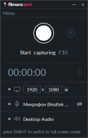 Весь нужный инструмент размещён всего на одной панели. Там регулируется разрешение видео, выбирается устройство для записи звука, а также находится кнопка запуска самой программы. Filmora Scrn по уморчанию включает полноэкранный режим, но при желании область записи можно и ограничить специальными ползунками. Корректировка области захвата ведётся даже в режиме прямого эфира.Ещё один плюс – наличия таймера включения и информации по горячим клавишам, которые используются, когда надо быстро запустить или остановить запись. Существенное отличие программы от аналогов – двухканальная запись. Что это? Очень просто, она может записывать не только действия на экране, но и вести запись с веб – камеры, которую пользователь подключил к компьютеру.