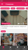 Стаканчик – замечательное мобильное приложение для Андроида, представляющее собой сборник самых популярных и интересных статей из разных областей. Здесь собраны лучшие статьи на тему науки, психологии, жизни, искусства и так далее. Разработчики реализовали в приложение простой и интуитивно понятный интерфейс, с которым разберётся даже дошкольник. Все статьи рассортированы по категориям. При этом программа позволяет рассортировать стать по отдельным темам. При помощи всего одного нажатия пользователь может отобрать самые популярные статьи за день, за неделю или месяц.