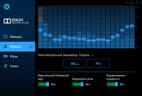 Dolby Digital Plus создана в простой оболочке и не содержит сложных панелей и меню. Графический интерфейс отличается дизайном нового поколения, который локализирован на русский язык. Все настройки для звука разделены на категории для удобного выбора.Главное окно драйвера содержит визуальное оформление, как во многих современных плеерах. Внизу рабочей области программы находятся ползунки и регуляторы, которые обеспечивают тонкую настройку параметров, включают «объемный звук» и активируют выравнивание.