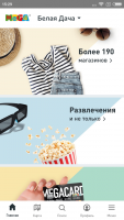 - показывает перечень магазинов и развлекательных мероприятий, проходящих в ТРЦ «МЕГА», который находится во всех крупных российских городах;