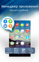 При первом запуске программное обеспечение автоматически сформирует весь имеющийся на девайсе софт по отдельным вкладками. Инструменты, которые используются чаще всего, будут вынесены на основной экран. Помимо прочего в пакете присутствует виджет, на котором демонстрируется погода и время.