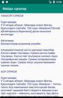 Майда суралар – функциональное приложение для мусульман, которые могут изучить краткие суры из Корана. Предлагаются тексты из четырнадцати глав мусульманской священной книги, который прописан на узбекском языке. Программное обеспечение предназначено для использования на мобильных устройствах под управлением ОС Андроид. В нем содержатся несколько коротких сур Корана. Благодаря данному приложению пользователи могут выучить тексты, необходимые для совершения намаза.