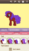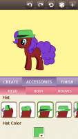 Pony Creator оснащёно двумя палитрами: первая – готовые цвета, а вторая – смешивание оттенков в произвольной форме. Подобрав интересный цвет фона, вы добавите аксессуары к вашей пони. Воспользуйтесь головными уборами, одеждой и усами.