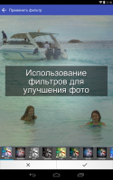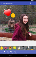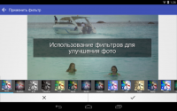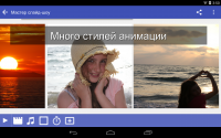 После отобрать файлов появится панель возможностей. Присутствует возможность подставить музыкальное сопровождение, взяв песню из интернет списка. Ещё существует возможность применить эффекты, наклейки и смайлики. При образовании слайд шоу нужно поставить длину трансляции всех кадров. Более того, существуют различные переходы между картинками. Существует опция просмотра итога заранее перед загрузкой в память. Софт даёт возможность отправить готовый результат друзьям в мессенджерах.Особенности