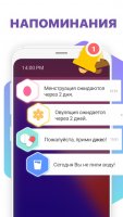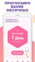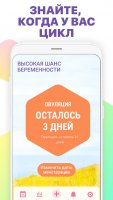 Женщины могут лично вписывать разную информацию и зафиксировать событие. Присутствует возможность вписать температуру, массу, симптомы, время крайнего полового акта и длительность сна. Основываясь на полученной информации, программа лично будет давать прогноз о продолжительности менструации, цикла и овуляции. Более того, софт может каждый день считать шанс беременности. В добавок существуют данные о том, когда примерно наступят месячные. Если это случится скоро, программа пришлёт определённое ПУШ оповещение.Особенности