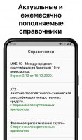 Справочник лекарств - программа для Андроид телефонов, которая является перечнем медицинский препаратов. В ней существуют инструкции, а ещё списки похожих препаратов и действующих веществ. Программа даёт возможность посмотреть описания медицинских препаратов, которые зарегистрированы в Российской Федерации.