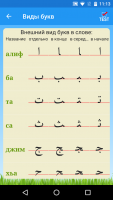 Чтобы начать учить буквы нужно перейти в специальный раздел меню, в котором можно познакомиться со всеми правилами написания арабских букв. Имеется и возможность прослушать правильное произношение. Для этого следует нажать на экране устройства на нужную букву.Правила чтения и порядок применения дополнительных знаков содержатся во вкладке «Огласовки». Кроме того, сервис помогает проверить правильность написания букв. От того в какой части слова стоит буква напрямую зависит ее изображение на письме. Чтобы просмотреть все варианты ее написания, необходимо нажать на необходимый символ и удерживать его.