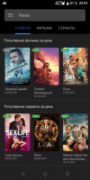 В основном меню программы находятся самые известные видеоролики. Они распределены на некоторые виды. В список вошли известные кино и сериалы за сутки и семь дней, а ещё предстоящие, с самым высоким рейтингом и тому подобное.При помощи свайпа есть возможность перейти на страницы, которые посвящены лишь кино и сериалам. Имеется способность находить их по тегам, отбирая военные фильмы, драматические, семейные кино, комедии, фэнтези и тому подобное. Более того, имеется нахождение видеоматериалов по году выхода и наименованию. Для этого имеется окно, которое находится вверху дисплея.