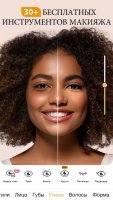 В программе имеется несколько инструментов, которые дают возможность добавить на фотографию макияж. При этом после добавления картинки программа автоматом выявит на ней лицо. Ещё есть возможность отобрать место для изменения самостоятельно. Редактор даёт возможность накрасить глаза, губы и отобрать цвет кожи. Имеется опция смены формы лица и убирания дефектов. Имеется способность сделать зубы белыми и увеличить размер губ. Более того, имеются инструменты для изменения формы бровей и замены окраса глаз.Прически