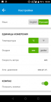 Вкладка параметров запускается по клику на клавишу вверху слева на дисплее. Она дает возможность отбирать единицы меры температуры, быстрота ветра, осадков и давления. Тут же есть возможность откорректировать показ компаса на основной странице.Нюансы