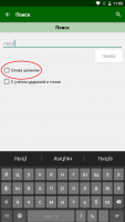 Вверху дисплея находится поисковое окно. Оно предоставляет возможность моментально искать желаемые слова. Для их вписывания имеется не только русская, но и адыгейская клавиатура. Она имеется в программе. Клиенты могут находить слова, смотреть примеры их применения во фразах, а ещё брать во внимание ударения и тоны.