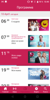Один из разделов приложения – телепрограмма. Здесь пользователям доступен поиск видеоматериалов с указанием времени их показа в эфире телеканала. Телепрограмма показывает передачи на ближайшую неделю.При желании пользователи могут сами находить передачи через поисковую строку, в которой необходимо написать название видеоматериала. Здесь же показываются рекомендуемые шоу.