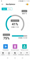 На главной странице программы находятся данные о состоянии памяти мобильного устройства. Также в этой вкладке пользователь может увидеть температуру аккумулятора и количество процентов заряда батареи. Внизу интерфейса находится ряд ярлыков:- Автоматическая перезагрузка телефона;
