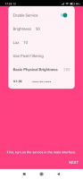 Необходимо отметить, что для корректной работы утилиты пользователь должен выдать ряд разрешений. Полный перечень необходимых прав отображается при первом включении программы.После выдачи требуемых разрешений пользователь сможет получить доступ к панели настроек. Через неё можно выбрать параметры яркости. Имеется возможность активировать режим пиксельной фильтрации, который уберёт эффект мерцания.