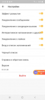 В качестве реакции можно использовать лайки и отправку виртуальных подарков. На отдельных вкладках доступны список контактов и история переписки. В настройках можно активировать уведомления о поступлении новых сообщений и лайках.