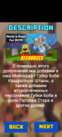 Губка Боб Моды для Майнкрафт – программа для ОС Android, которая позволяет изменить игровой сюжет в многопользовательской игре. Пользователь получает возможность добавлять новые персонажей, карты, скины и многое другое.