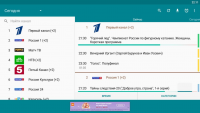 В главном меню отображается план трансляций для выбранных телеканалов. Указывается название передач и соответствующее время начала (используется московское время). При нажатии на определенную передачу откроется панель с кратким описанием. Нажатие на тайм код активирует напоминание – перед началом пользователь получит соответствующее уведомление.Каталог можно загрузить только на текущий день или на всю неделю. Есть возможность посмотреть программу на определенную дату.