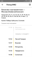 Информация в приложении постоянно обновляется, поэтому пользователю не стоит волноваться о ее достоверности. После открытия расписания определенной электрички, будет доступна информация о его местонахождении в данный момент, и вместе с этим на каких станциях и на сколько останавливается выбранные электропоезд. Если произойдут какие-либо изменения, например электричка будет задерживаться, то приложение сразу же оповестит об этом пользователя.Возможности программы