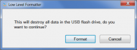 Для запуска процесса форматирования необходимо нажать кнопку «Format» и дождаться уведомления о завершении процесса. На этапе очистки крайне не рекомендуется извлекать накопитель из разъема, поскольку это может привести к неработоспособности устройства.Время процесса форматирования зависит от общего объема носителя. Стоит учитывать, что выполняется низкоуровневое форматирование. Перезапись данных осуществляется на уровне отдельных ячеек, поэтому восстановить файлы при помощи специального ПО будет невозможно (в отличие от быстрого форматирования). В некоторых ситуациях это может быть полезно, например, если устройство отдается другим людям и необходима гарантия, что личные данные не будут восстановлены. Это маловероятно, но технически возможно.