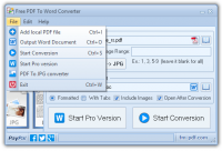 Free PDF to Word Converter - программа, способная преобразовать документов в несколько кликов, без выполнения сложных манипуляций. Основная задача программного обеспечения: преобразование документов Portable Document Format (PDF) в форматы, используемые в популярными текстовыми редакторами линейки Microsoft Office (DOC, DOCX). Доступно выполнение конвертации в формат RTF, установка дополнительного расширения позволит проводить преобразования в формат JPG.