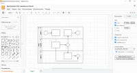 Приложение подойдет для начинающих пользователей. Основная работа осуществляется в режиме конструктора. Левая часть окна содержит набор инструментов – простые фигуры, стрелки, текстовые блоки и так далее. После выбора элемента его нужно просто перетянуть мышкой на нужное место листа. Поддерживается вращение, изменение размера и другие опции.Далее следует указать связи между объектами и добавить в нужные места надписи. В настройках есть возможность указать тип соединения, а также настроить общий стиль новой диаграммы.