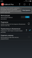 Мобильная версия блокировщика не позволяет пользователю составить белые списки. В такие списки можно вносить банеры, которые программа будет показывать. Вместо этого, можно выделять типы блокируемых файлов. Это не так удобно, но не критично.Отображение утилиты, возможно, настраивать в статус баре. Пользователь может настроить его видимость, чтобы управлять AdBlock было несколько удобнее. Если удобно настроить эти параметры, можно включать и настраивать типы блокируемых файлов прямо во время использования программы, или при сёрфинге браузера. В утилите присутствует меню основных настроек. Из этого меню пользователь может настраивать параметры активной фильтрации.