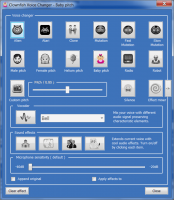 После установки программы соответствующая иконка будет добавлена в область уведомлений. При вызове контекстного меню данного элемента можно изменить текущий режим работы программы и получить доступ к основным настройкам. При активации соответствующей опции программа будет в реальном времени менять голос пользователя.Можно выбрать несколько эффектов из представленного набора. Есть Возможность сделать голос женским или мужским, добавить эхо или набор шума. Предусмотрена возможность менять чувствительность микрофона, тембр речи и другие параметры.