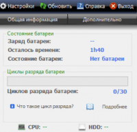 Предусмотрена возможность заметно повысить производительность батареи. После установки и запуска на основной панели отобразится основная информация о текущем режиме работы батареи. Также отображаются параметры мощности и процент износа.Дополнительная панель отображает основную информацию о других узлах ноутбука. Есть возможность посмотреть текущий температурный режим ЦП, данные о жестком диске и так далее.