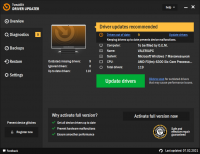 После старта приложение автоматически запускает полное сканирование системы, определяя все компоненты и версии драйверов. После этого в виде списка отображаются все устройства, которые требуют обновления. У пользователя есть возможность выбрать нужные записи для обновления. Перед загрузкой есть возможность посмотреть информацию об обновлении – разработчик, дата выпуска и полная версия.Стоит отметить, что приложение распространяется на платной основе. По умолчанию загружается пробная версия некоторыми ограничениями. В частности, отсутствует возможность перейти к этапу загрузки обновлений. Для перехода на полную версию необходимо приобрести лицензионный ключ. Также требуется активный доступ в интернет.