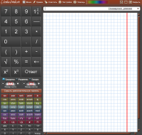 Основная рабочая область имитирует стандартный лист бумаги. В настройках можно сразу изменить параметры клеток и размер листа. Основные элементы управления находятся выше. В верхней части окна также находится поле для ввода примера.Примеры можно решать в столбик, активно используя формулы и уравнения. Вместе с ответом сразу отображаются все этапы промежуточных решений. Для обозначения дробной части можно использовать запятые или точки.