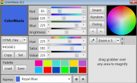 ColorMania - представленная утилита помогает юзерам производить корректировку цветовой палитры на всех современных системах Windows. В ней присутствуют основные инструменты, которые определяют цвета на самых разнообразных объектах. При необходимости можно выбрать для детального анализа пипетку или для опознавания цвета на шаблоне лупу. Чтобы провести опознавание оттенка, человек должен просто навести выбранный инструмент на объект.