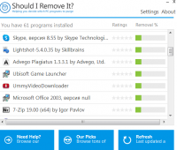 Should I Remove It – это Windows приложение, содержащее в себе базу данных о том, как часто другие юзеры удаляют тот или иной софт, а какой оставляют на устройстве. Имеется возможность увидеть рейтинг утилит и процент их удаления. У приложения англоязычный интерфейс.